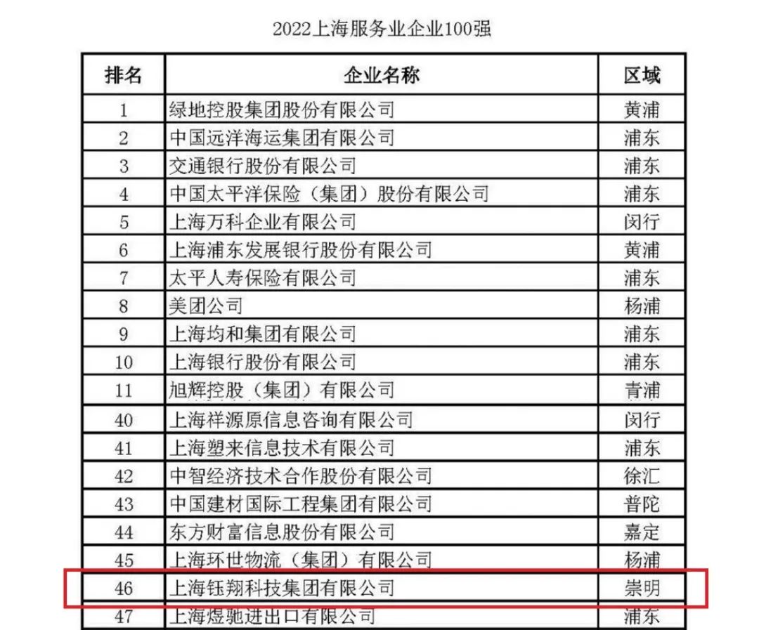 上海鈺翔科技集團有限公司憑借卓越的綜合實力、持續(xù)提升的科技創(chuàng)新能力,2021年實現(xiàn)營業(yè)收入119.5億元,榮獲“2022上海企業(yè)100強第88名”、“2022上海民營企業(yè)100強第40名”、“2022上海服務業(yè)企業(yè)100強第46名”、“2022上海民營服務業(yè)企業(yè)100強第24名”四項榮譽。