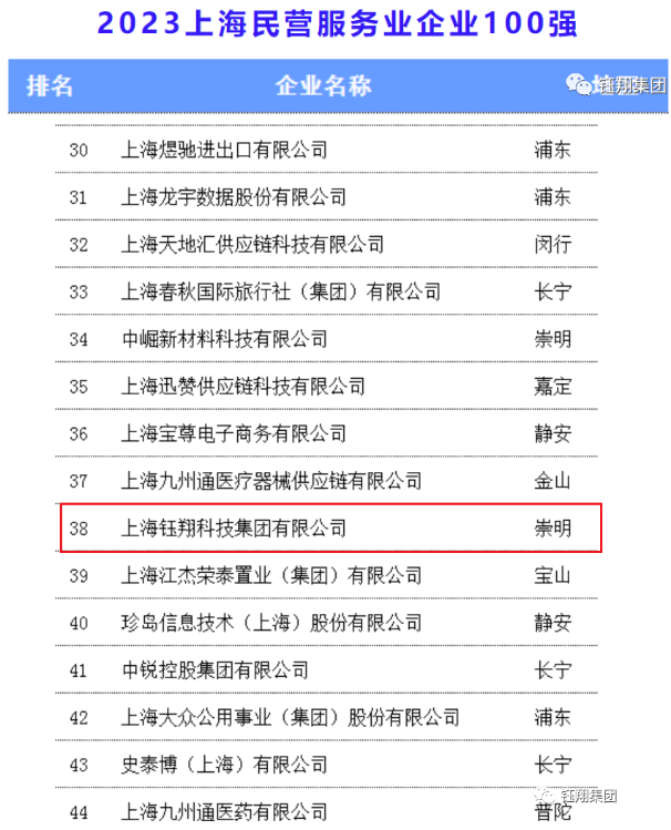 上海鈺翔科技集團有限公司2022年實現營業收入76.96億元,榮獲“2023上海民營企業100強第61名”、“2023上海服務業企業100強第66名”、“2023上海民營服務業企業100強第38名”三項榮譽。
