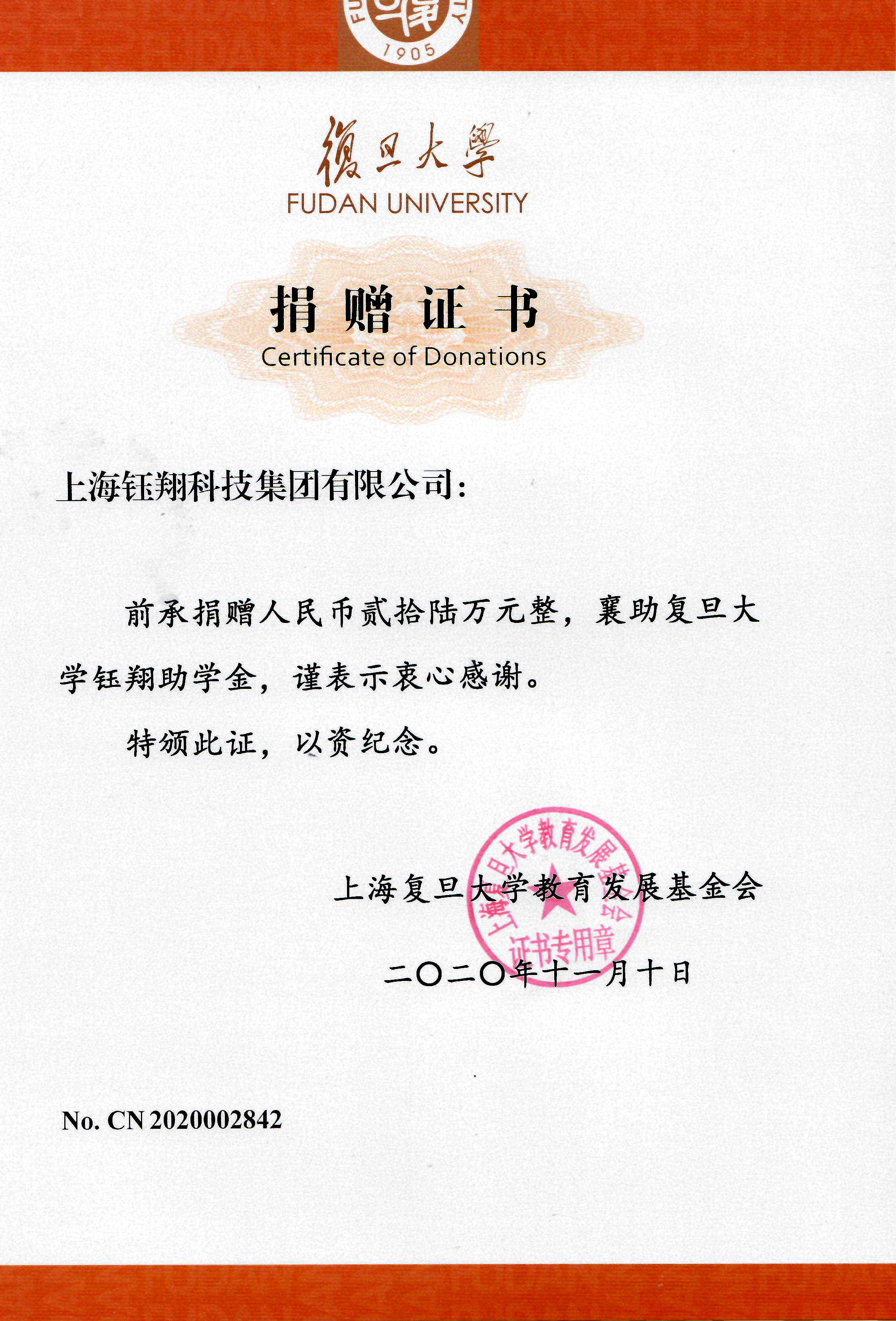 上海復旦大學教育發展基金會26萬元捐贈證書
