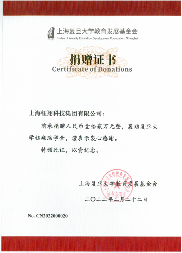 上海復(fù)旦大學(xué)教育發(fā)展基金會(huì)12萬(wàn)元捐贈(zèng)證書(shū)